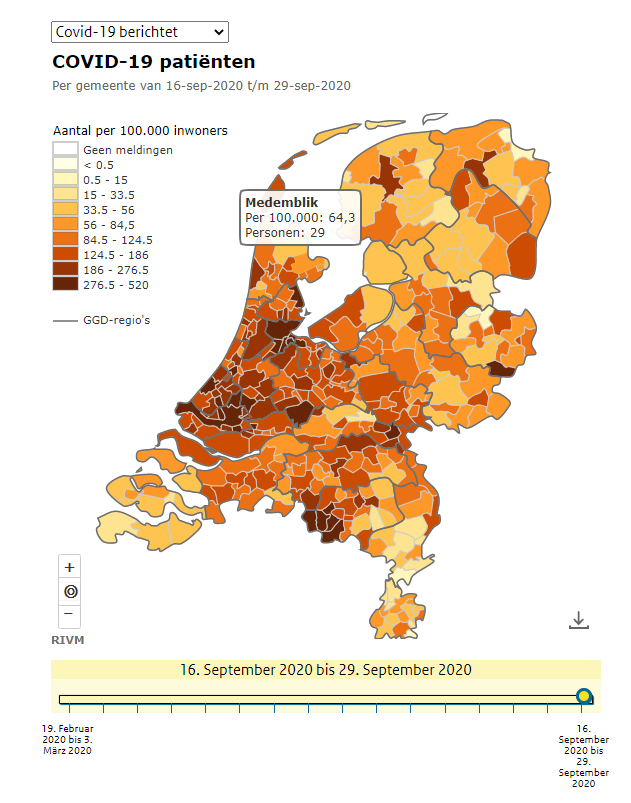 Genau wie in weiten Teilen Deutschlands hat sich auch die Lage in den Niederlanden wieder verschärft. Aktuell (Stand: 29.9.2020) hat das RKI eine Reisewarnung für Noord-Holland herausgegeben. Die Bundesregierung prüft fortlaufend, inwieweit Gebiete als Risikogebiete einzustufen sind. Daher kann es auch zu kurzfristigen Änderungen kommen. Medemblik ist bisher vergleichsweise noch nicht so stark vom Coronavirus betroffen – vor allem im Vergleich zu NRW. Diese Karte zeigt die Anzahl der hospitalisierten Patienten pro 100.000 Einwohner.